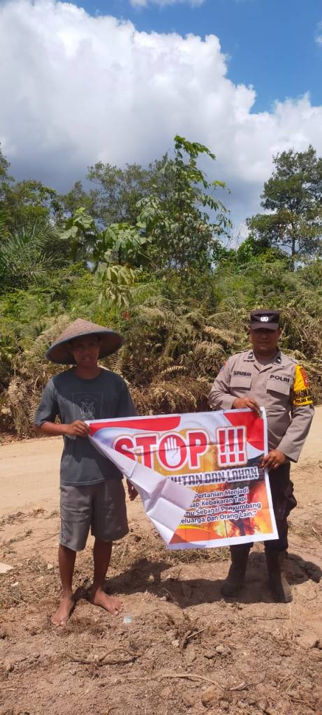 Kendawangan – Anggota Bhabinkamtibmas Polsek Kendawangan cegah kebakaran hutan dan lahan (Karhutla) melalui hinbauan dan sosialisasi kepada masyarakat di Kec. Kendawangan