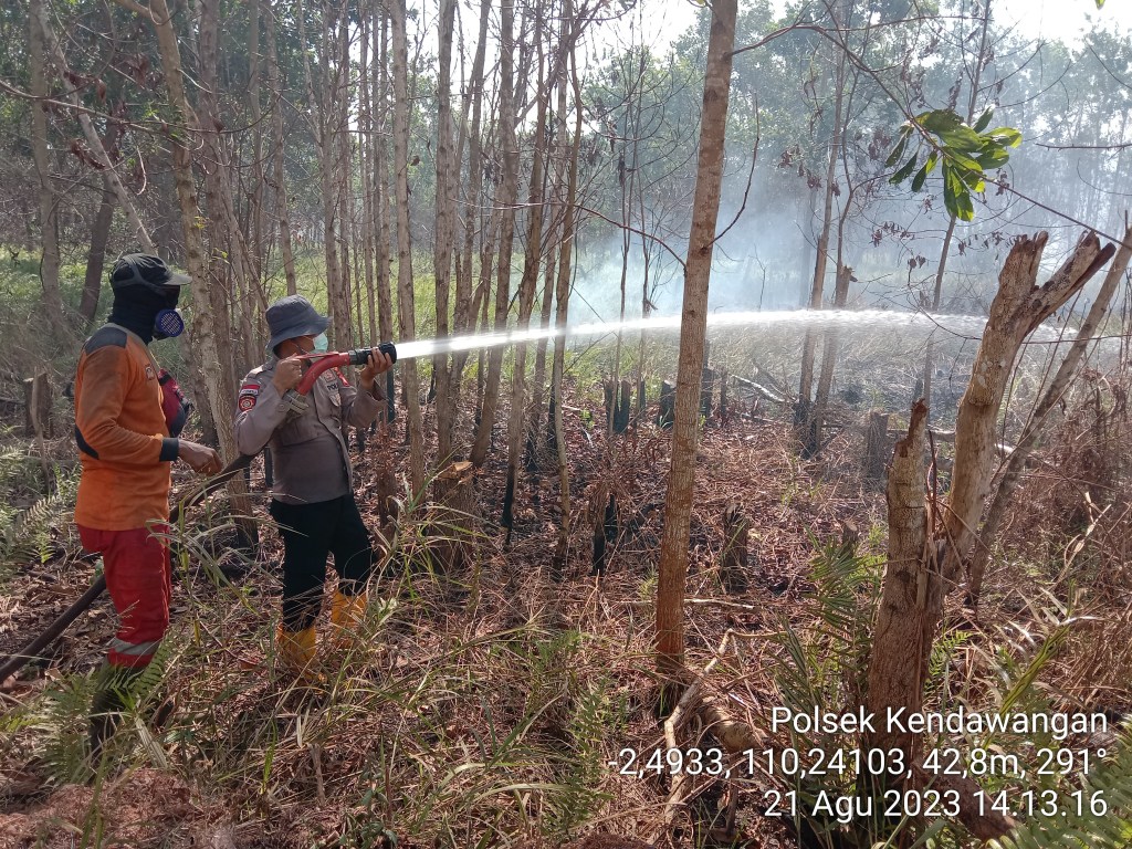 Kendawangan – Personil gabungan melaksanakan pemadaman titik api / Hs yang berada di Dusun Parit Timur Desa Banjar Sari Kecamatan Kendawangan, Senin (21/08/2023)