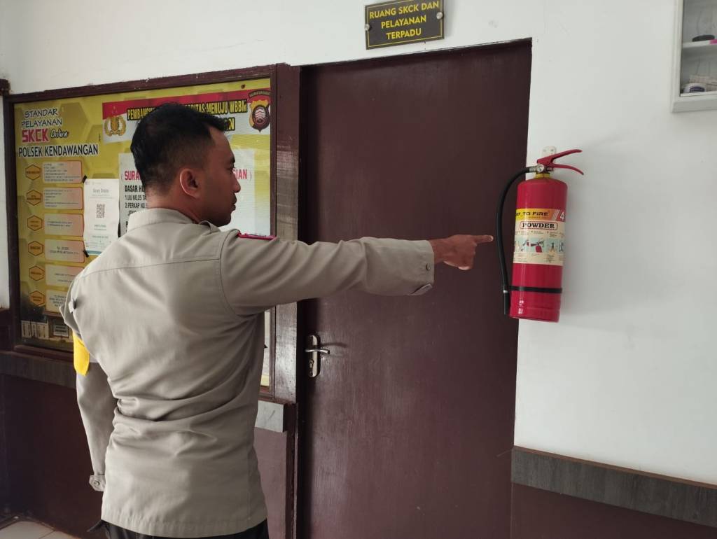 “Kapolsek Kendawangan Iptu Faldo Yefri Oktavianus S.Tr.K., M.H mengatakan pengecekan Apar ( Alat Pemadam Kebakaran ) rutin dilaksanakan setiap piket, guna mengantisipasi pencegahan terjadi kebakaran di mako maupun disekitar asrama Polsek dan Apar yang berada di Mako layak pada saat ingin digunakan”.