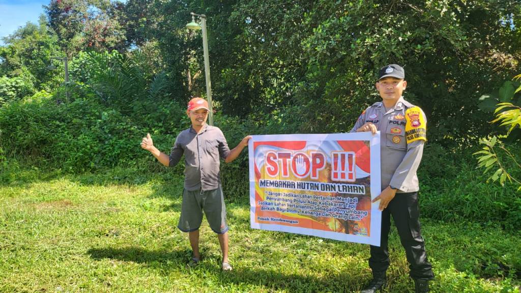 Salah satu sosialisasi yang dilakukan Bhabinkamtibmas yaitu dengan membentangkan banner dan menyampaikan himbauan tentang larangan dan sanksi hukum bagi pembuka lahan dengan cara di bakar