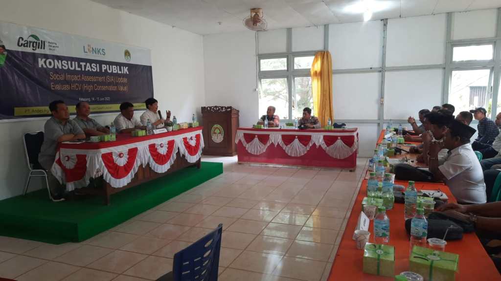 Kegiatan Konsultasi Publik Sosial Impact Assessment (SIA) Update Evaluasi High Conservation Value (HCV) PT. CARGIL Group dilaksanakan di Kantor Camat Kendawangan Desa Mekar Utama Kecamatan Kendawangan