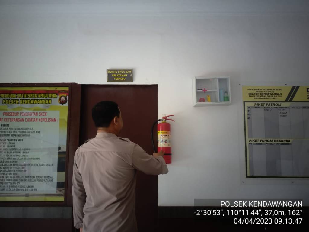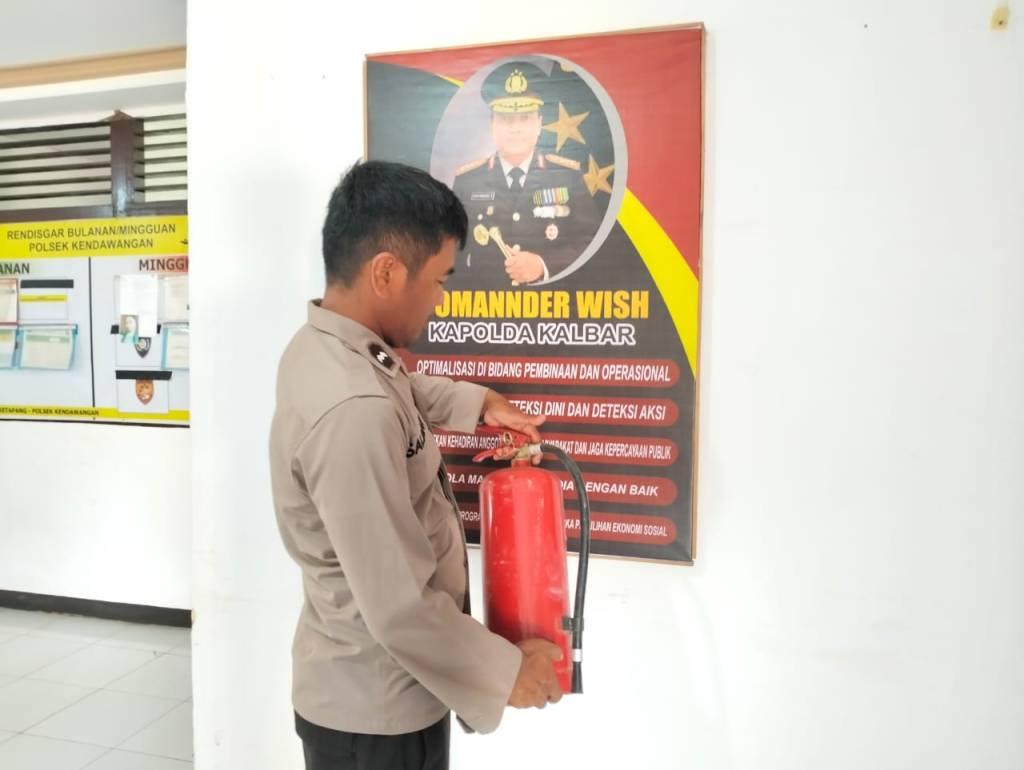 Kendawangan, Anggota Polsek Kendawangan yang melaksanakan piket jaga mako rutin melaksanakan pengecekan Apar ( Alat Pemadam Kebakaran ) yang berada di mako Polsek Kendawangan