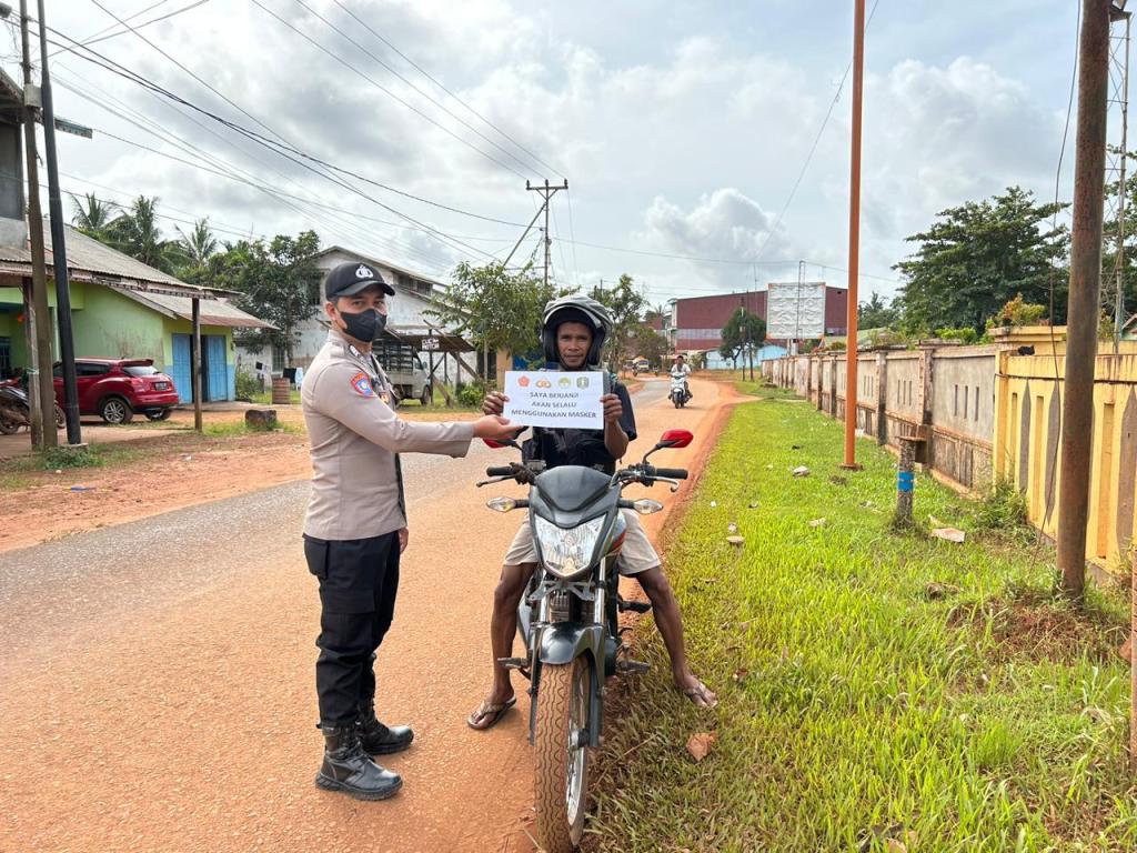 Kendawangan, Kanit Binmas Polsek Kendawangan melakukan kegiatan himbauan / sosialisasi penggunaan masker di depan Mako Polsek Kendawangan Dusun Batu Begendang Desa Mekar Utama Kec. Kendawangan, Minggu (08/01/2023)