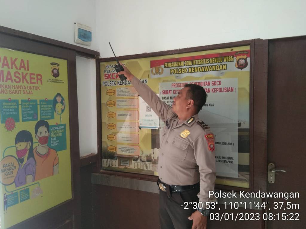 Seperti yang dilakukan oleh piket jaga Regu B Aipda H. Gunarto, selaku Ka SPKT piket jaga mako Polsek Kendawangan pada hari Selasa, (03/01/2023), mengecek seluruh instalasi listrik di Mako Polsek Kendawangan secara menyeluruh, dari dalam hingga keluar bangunan.