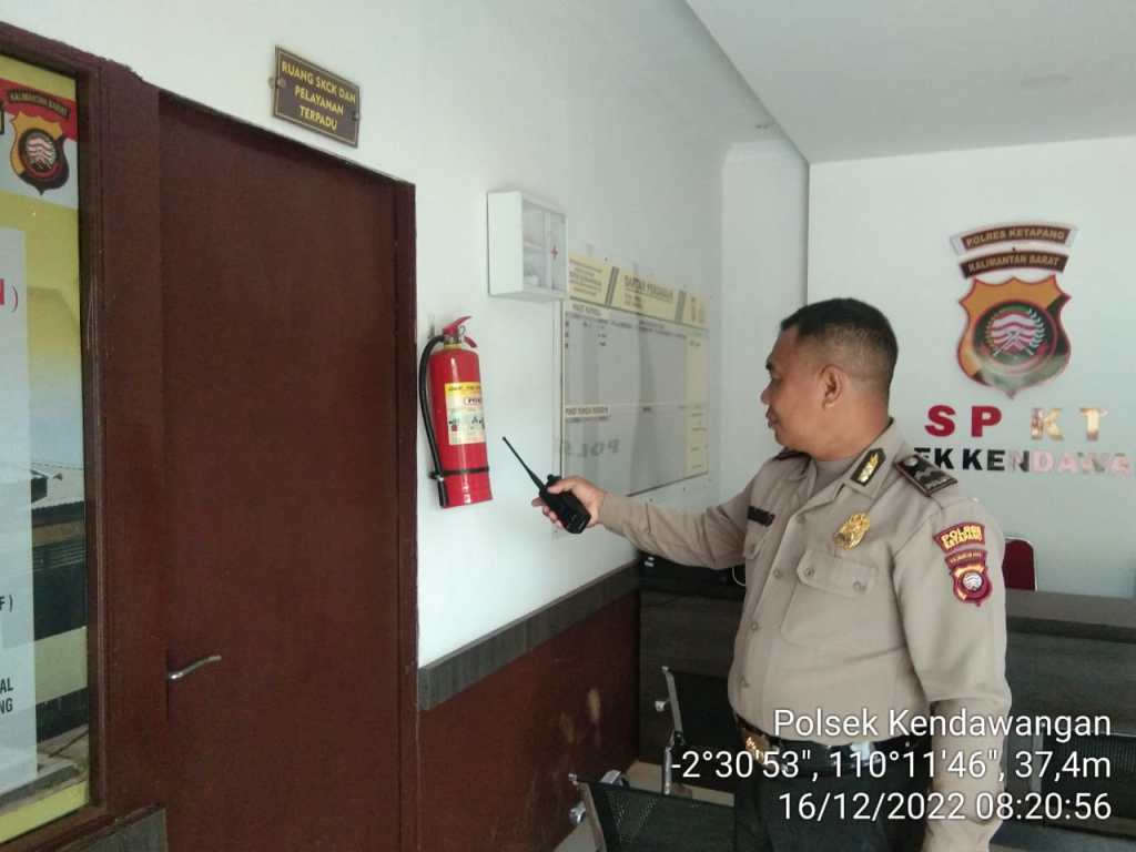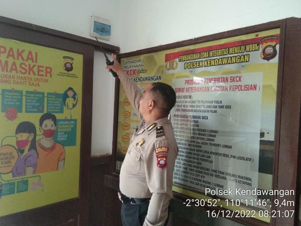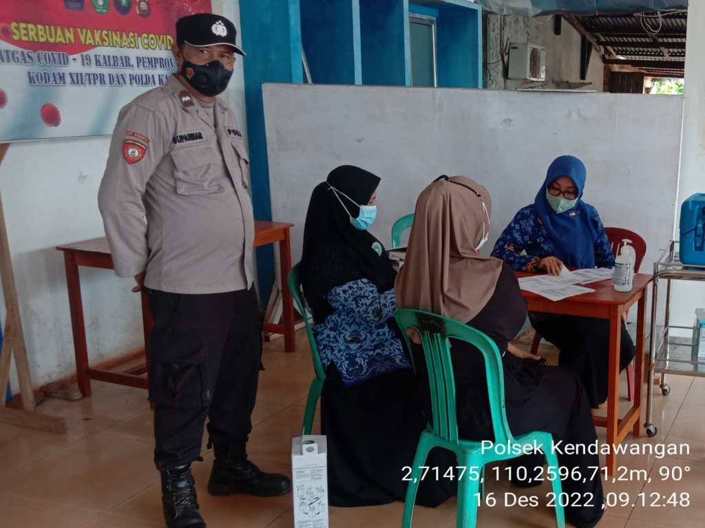 Polsek Kendawangan – Anggota Polsek Kendawangan Aipda Suparman melaksanakan kegiatan pengamanan sekaligus monitoring penyuntikan Vaksin Covid-19 di Pukesmas Kendawangan.