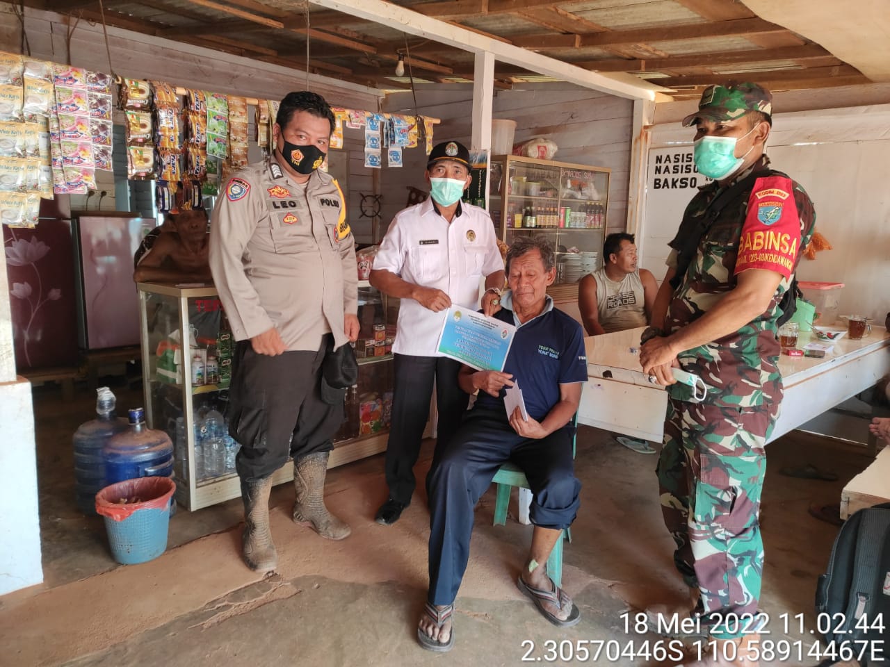 Kendawangan– Bhabinkamtibmas Polsek Kendawangan Polres Ketapang Bripka Leo Gedung dan Babinsa Suka Harapan melaksanakan pengamanan kegiatan pendistribusian dana BLT Dana Desa tahap I, II dan III Tahun 2022 di Desa Suka Harapan Kec. Kendawangan Kabupaten Ketapang, Rabu (18/05/2022).